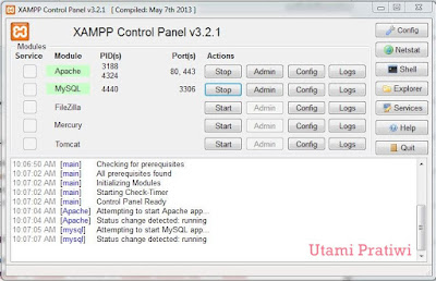 dijalankan seluruh aplikasi yang ada di XAMPP, yang diantaranya adalah Apache Web Server dan MySQL.Untuk test drive dari XAMPP, klik tombol Start